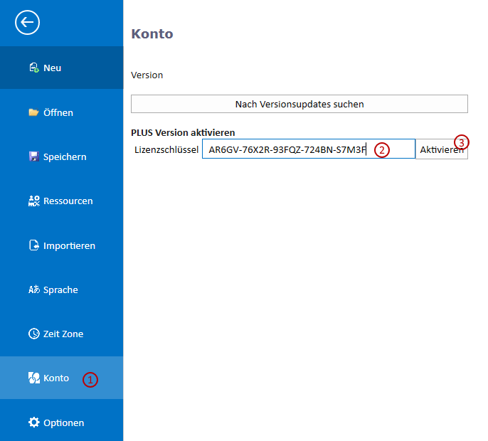Danach klicken Sei auf Konto (Abbildung 2 - 1), kopieren den Lizenzschlüssel in das dafür vorgesehene Feld (2) und klicken aktivieren. Die Aktivierung benötigt eine Internetverbindung. Nach Abschluss dieser Aktivierungssequenz können Sie nun PROX QT in der PLUS Version nutzen.